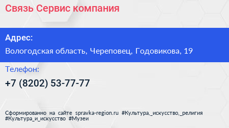 Связь-Сервис, компания по адресу Вологодская область, Череповец, Годовикова, 19 в дальнейшем Организация, размещена в следующих категориях: