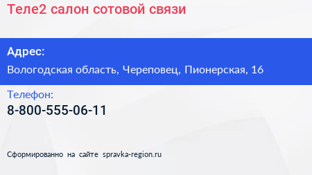 Теле2, салон сотовой связи по адресу Вологодская область, Череповец, Пионерская, 16 в дальнейшем Организация, размещена в следующих категориях: