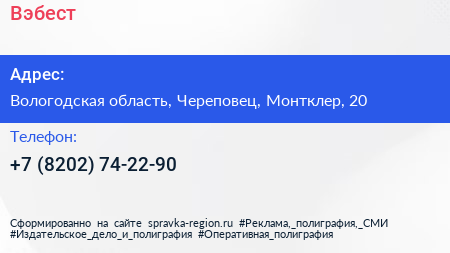 Вэбест по адресу Вологодская область, Череповец, Монтклер, 20 в дальнейшем Организация, размещена в следующих категориях: