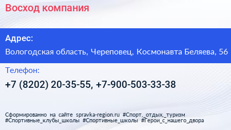 Восход, компания по адресу Вологодская область, Череповец, Космонавта Беляева, 56 в дальнейшем Организация, размещена в следующих категориях: