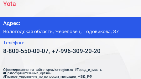 Yota по адресу Вологодская область, Череповец, Годовикова, 37 в дальнейшем Организация, размещена в следующих категориях: