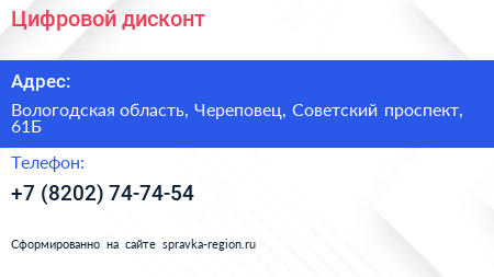 Цифровой, дисконт по адресу Вологодская область, Череповец, Советский проспект, 61Б в дальнейшем Организация, размещена в следующих категориях: