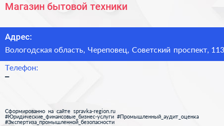 Магазин бытовой техники по адресу Вологодская область, Череповец, Советский проспект, 113 в дальнейшем Организация, размещена в следующих категориях: