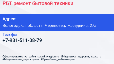 РБТ, ремонт бытовой техники по адресу Вологодская область, Череповец, Наседкина, 27а в дальнейшем Организация, размещена в следующих категориях: