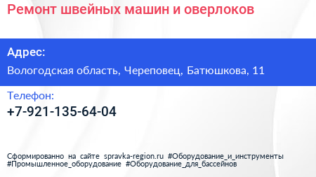 Ремонт швейных машин и оверлоков по адресу Вологодская область, Череповец, Батюшкова, 11 в дальнейшем Организация, размещена в следующих категориях: