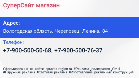 СуперСайт, магазин по адресу Вологодская область, Череповец, Ленина, 84 в дальнейшем Организация, размещена в следующих категориях: