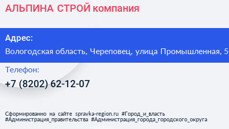 АЛЬПИНА СТРОЙ, компания по адресу Вологодская область, Череповец, улица Промышленная, 5 в дальнейшем Организация, размещена в следующих категориях: