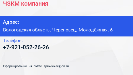 ЧЗКМ, компания по адресу Вологодская область, Череповец, Молодёжная, 6 в дальнейшем Организация, размещена в следующих категориях: