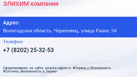 ЭЛИХИМ, компания по адресу Вологодская область, Череповец, улица Раахе, 54 в дальнейшем Организация, размещена в следующих категориях: