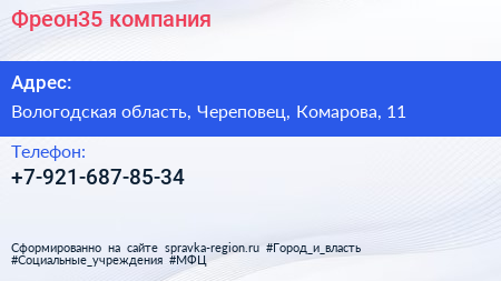 Фреон35, компания по адресу Вологодская область, Череповец, Комарова, 11 в дальнейшем Организация, размещена в следующих категориях: