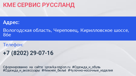 КМЕ СЕРВИС РУССЛАНД по адресу Вологодская область, Череповец, Кирилловское шоссе, 86е в дальнейшем Организация, размещена в следующих категориях: