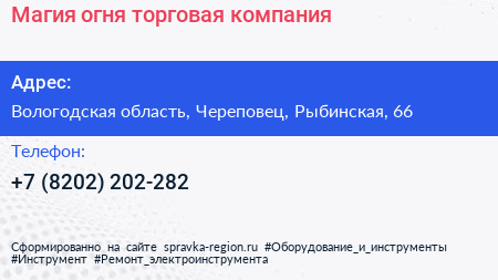 Магия огня, торговая компания по адресу Вологодская область, Череповец, Рыбинская, 66 в дальнейшем Организация, размещена в следующих категориях: