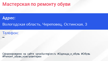 Мастерская по ремонту обуви по адресу Вологодская область, Череповец, Остинская, 3 в дальнейшем Организация, размещена в следующих категориях: