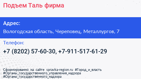 Подъем-Таль, фирма по адресу Вологодская область, Череповец, Металлургов, 7 в дальнейшем Организация, размещена в следующих категориях: