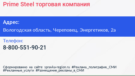 Prime Steel, торговая компания по адресу Вологодская область, Череповец, Энергетиков, 2а в дальнейшем Организация, размещена в следующих категориях: