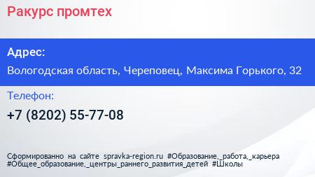 Ракурс-промтех по адресу Вологодская область, Череповец, Максима Горького, 32 в дальнейшем Организация, размещена в следующих категориях: