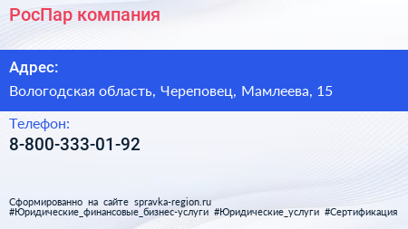 РосПар, компания по адресу Вологодская область, Череповец, Мамлеева, 15 в дальнейшем Организация, размещена в следующих категориях: