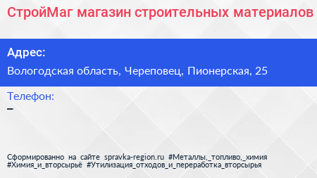 СтройМаг, магазин строительных материалов по адресу Вологодская область, Череповец, Пионерская, 25 в дальнейшем Организация, размещена в следующих категориях: