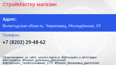 СтройМастер, магазин по адресу Вологодская область, Череповец, Молодёжная, 19 в дальнейшем Организация, размещена в следующих категориях: