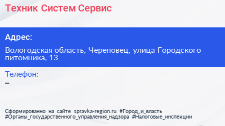 Техник Систем Сервис по адресу Вологодская область, Череповец, улица Городского питомника, 13 в дальнейшем Организация, размещена в следующих категориях: