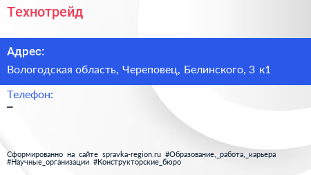 Технотрейд по адресу Вологодская область, Череповец, Белинского, 3 к1 в дальнейшем Организация, размещена в следующих категориях:
