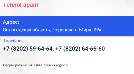 ТеплоГарант по адресу Вологодская область, Череповец, Мира, 29а в дальнейшем Организация, размещена в следующих категориях: