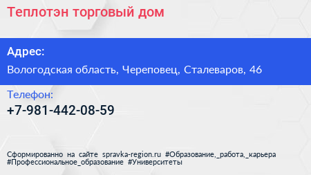 Теплотэн, торговый дом по адресу Вологодская область, Череповец, Сталеваров, 46 в дальнейшем Организация, размещена в следующих категориях: