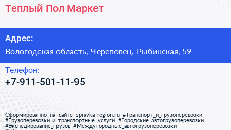 Теплый Пол Маркет по адресу Вологодская область, Череповец, Рыбинская, 59 в дальнейшем Организация, размещена в следующих категориях: