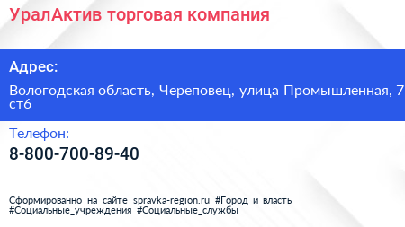 УралАктив, торговая компания по адресу Вологодская область, Череповец, улица Промышленная, 7 ст6 в дальнейшем Организация, размещена в следующих категориях: