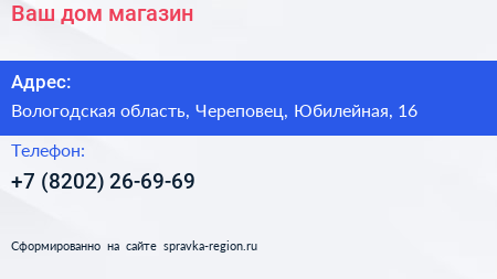 Ваш дом, магазин по адресу Вологодская область, Череповец, Юбилейная, 16 в дальнейшем Организация, размещена в следующих категориях:
