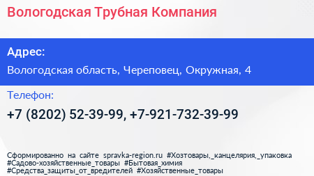 Вологодская Трубная Компания по адресу Вологодская область, Череповец, Окружная, 4 в дальнейшем Организация, размещена в следующих категориях: