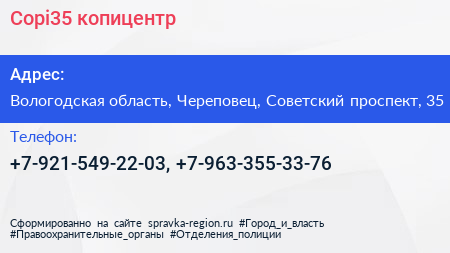 Copi35, копицентр по адресу Вологодская область, Череповец, Советский проспект, 35 в дальнейшем Организация, размещена в следующих категориях: