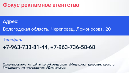 Фокус, рекламное агентство по адресу Вологодская область, Череповец, Ломоносова, 20 в дальнейшем Организация, размещена в следующих категориях: