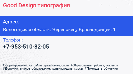 Good Design, типография по адресу Вологодская область, Череповец, Краснодонцев, 1 в дальнейшем Организация, размещена в следующих категориях: