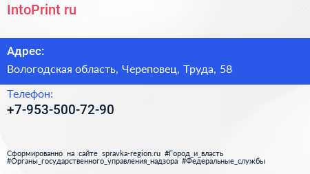 IntoPrint.ru по адресу Вологодская область, Череповец, Труда, 58 в дальнейшем Организация, размещена в следующих категориях: