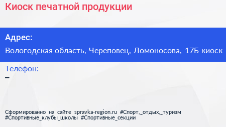 Киоск печатной продукции по адресу Вологодская область, Череповец, Ломоносова, 17Б киоск в дальнейшем Организация, размещена в следующих категориях: