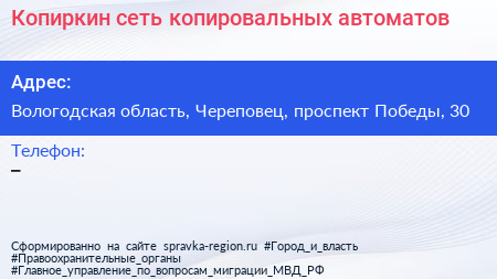 Копиркин, сеть копировальных автоматов по адресу Вологодская область, Череповец, проспект Победы, 30 в дальнейшем Организация, размещена в следующих категориях: