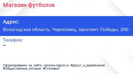 Магазин футболок по адресу Вологодская область, Череповец, проспект Победы, 200 в дальнейшем Организация, размещена в следующих категориях: