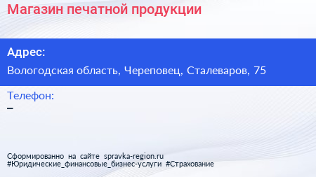 Магазин печатной продукции по адресу Вологодская область, Череповец, Сталеваров, 75 в дальнейшем Организация, размещена в следующих категориях: