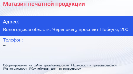 Магазин печатной продукции по адресу Вологодская область, Череповец, проспект Победы, 200 в дальнейшем Организация, размещена в следующих категориях: