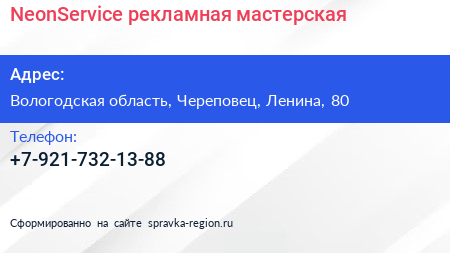 NeonService, рекламная мастерская по адресу Вологодская область, Череповец, Ленина, 80 в дальнейшем Организация, размещена в следующих категориях: