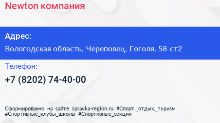 Newton, компания по адресу Вологодская область, Череповец, Гоголя, 58 ст2 в дальнейшем Организация, размещена в следующих категориях:
