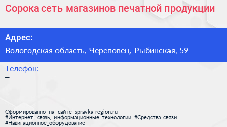 Сорока, сеть магазинов печатной продукции по адресу Вологодская область, Череповец, Рыбинская, 59 в дальнейшем Организация, размещена в следующих категориях: