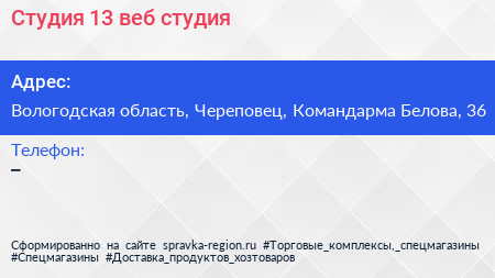 Студия 13, веб-студия по адресу Вологодская область, Череповец, Командарма Белова, 36 в дальнейшем Организация, размещена в следующих категориях: