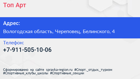 Топ-Арт по адресу Вологодская область, Череповец, Белинского, 4 в дальнейшем Организация, размещена в следующих категориях:
