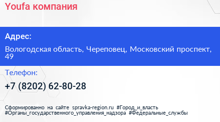Youfa, компания по адресу Вологодская область, Череповец, Московский проспект, 49 в дальнейшем Организация, размещена в следующих категориях: