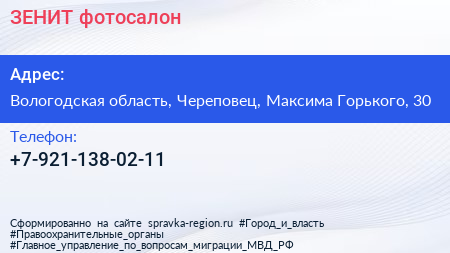 ЗЕНИТ, фотосалон по адресу Вологодская область, Череповец, Максима Горького, 30 в дальнейшем Организация, размещена в следующих категориях: