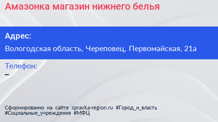 Амазонка, магазин нижнего белья по адресу Вологодская область, Череповец, Первомайская, 21а в дальнейшем Организация, размещена в следующих категориях: