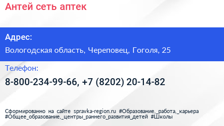 Антей, сеть аптек по адресу Вологодская область, Череповец, Гоголя, 25 в дальнейшем Организация, размещена в следующих категориях: