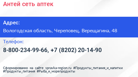 Антей, сеть аптек по адресу Вологодская область, Череповец, Верещагина, 48 в дальнейшем Организация, размещена в следующих категориях: